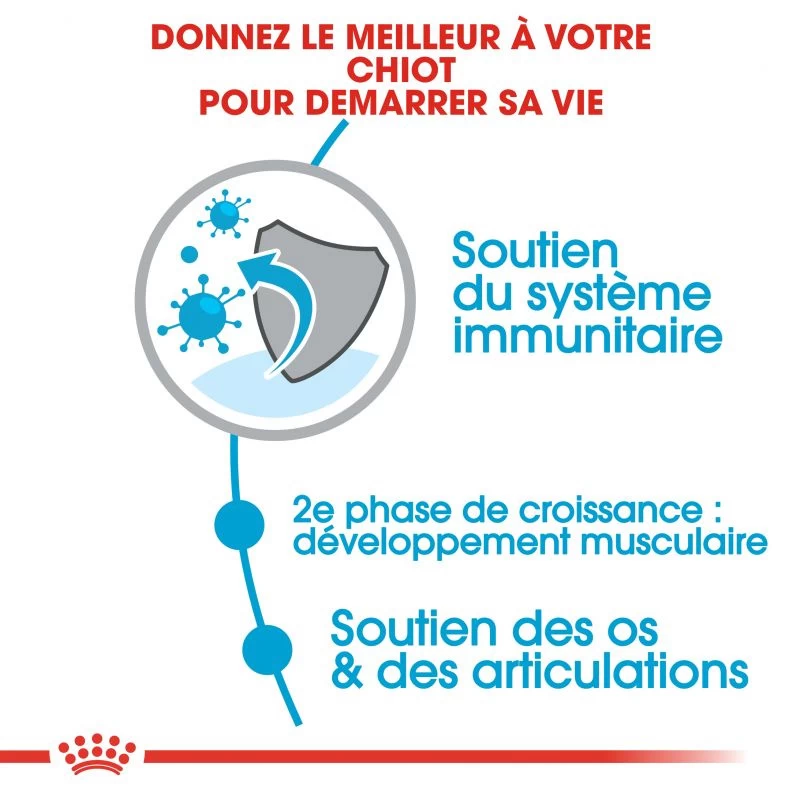Les proportions équilibrées de probiotiques et de prébiotiques protègent le tractus gastro-intestinal des irritations tout en soutenant l’immunité du chien. Les précieuses protéines contenues dans ROYAL CANIN Giant Junior, soutenues par l’ajout de L-carnitine, contribuent à la formation du tissu musculaire chez un animal à croissance rapide et préviennent en même temps un éventuel surpoids. Avec les bonnes proportions de phosphore et de calcium, les aliments secs pour chiots de races géantes de 8 à 18/24 mois renforcent le squelette de votre chiot et lui permettent de grandir en fonction de son âge. L’ajout de chondroïtine et de glucosamine a un effet positif sur l’état des articulations, favorisant la sécrétion d’une quantité adéquate de liquide articulaire. L’huile de poisson fournit des acides gras insaturés pour soutenir le cerveau et le système nerveux, facilitant les processus d’apprentissage et améliorant la concentration pendant l’entraînement.
