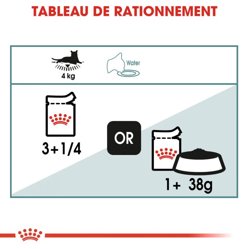 Les aliments en sauce ROYAL CANIN Hairball Care favorisent également le maintien d’un poids corporel optimal, grâce à leur faible teneur en matières grasses. Les acides gras essentiels contenus dans l’aliment sont une source d’énergie.