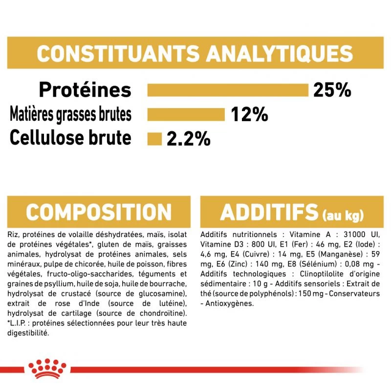 Dans l’aliment ROYAL CANIN Miniature Schnauzer Adult, la teneur en matières grasses est modĂ©rĂ©e, ce qui, associĂ© Ă une dose quotidienne d’exercice, favorise le maintien d’un poids corporel sain. Les croquettes ROYAL CANIN Miniature Schnauzer Adult ont Ă©tĂ© spĂ©cialement dĂ©veloppĂ©es pour les chiens Schnauzer nains. Grâce Ă l’utilisation de composĂ©s liant le calcium (chĂ©lateurs), la formule alimentaire favorise l’hygiène bucco-dentaire en inhibant la formation de tartre.