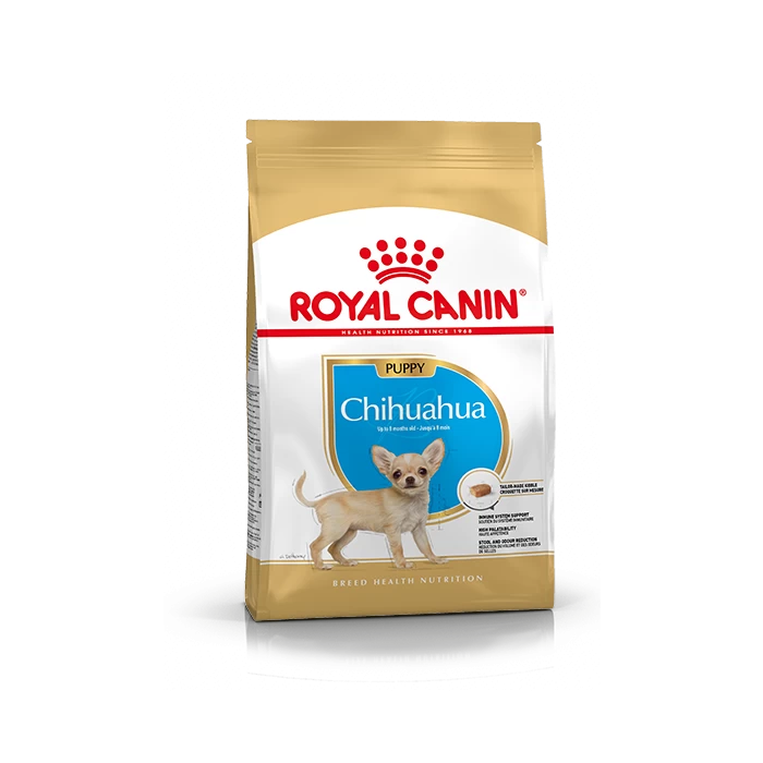 Aliment complet pour chiens – Spécialement conçu pour un Chiot Chihuahua, de 2 à 8 mois. La période de croissance est une étape importante pour votre chiot Chihuahua. C’est pourquoi il est essentiel de lui procurer des nutriments qui favorisent une santé optimale. ROYAL CANIN® Chihuahua Puppy est spécialement formulé pour répondre à tous les besoins nutritionnels de votre jeune Chihuahua et convient aux Chihuahua de moins de 8 mois. ROYAL CANIN® Chihuahua Puppy est très appétissant et peut satisfaire les palais des Chihuahua les plus exigeants. Grâce à son complexe d’antioxydants (dont la vitamine E), ROYAL CANIN® Chihuahua Puppy aide à renforcer les défenses naturelles de votre chiot tout au long de sa croissance. Le mélange de nutriment de haute qualité que contient ROYAL CANIN® Chihuahua Puppy contribue également au maintien de la santé digestive et à réduire les odeurs et le volume de selles. De plus, les croquettes ROYAL CANIN® Chihuahua Puppy sont conçues sur mesure. En effet, les chiens de race Chihuahua ont une petite mâchoire, les croquettes sont adaptées à la petite mâchoire du chiot Chihuahua, pour lui faciliter la prise et la mastication de la nourriture.